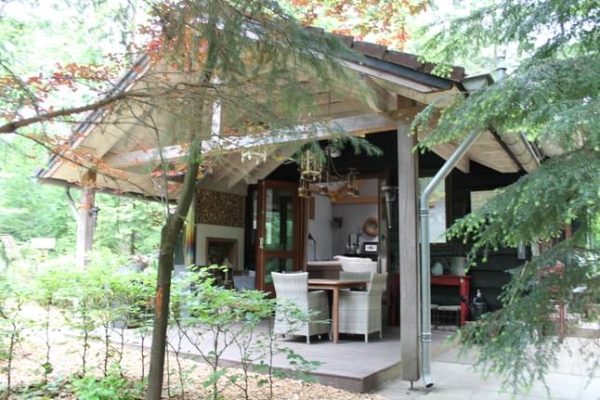 Dit boshuisje ligt op een klein rustig vakantiepark midden in de bossen. Geniet van de privacy en de rust in de grote beboste tuin. Buiten is het heerlijk relaxen op de overdekte terras met veranda en houtkachel.